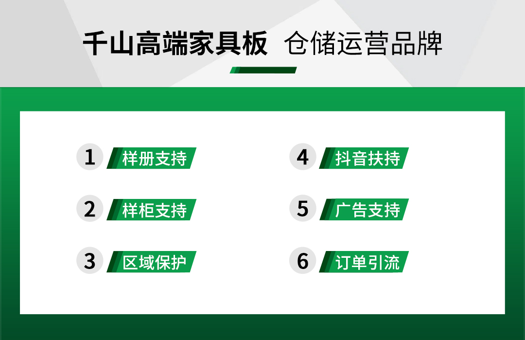 作為高端家具板倉(cāng)儲(chǔ)運(yùn)營(yíng)品牌,千山依托家具板倉(cāng)儲(chǔ)一體化運(yùn)營(yíng)模式,將持續(xù)為全國(guó)加盟商及消費(fèi)者提供更優(yōu)質(zhì)的家具板產(chǎn)品與服務(wù),期待更多的家具廠伙伴加入千山家具板倉(cāng)儲(chǔ)運(yùn)營(yíng)事業(yè),乘風(fēng)并進(jìn),共謀發(fā)展!