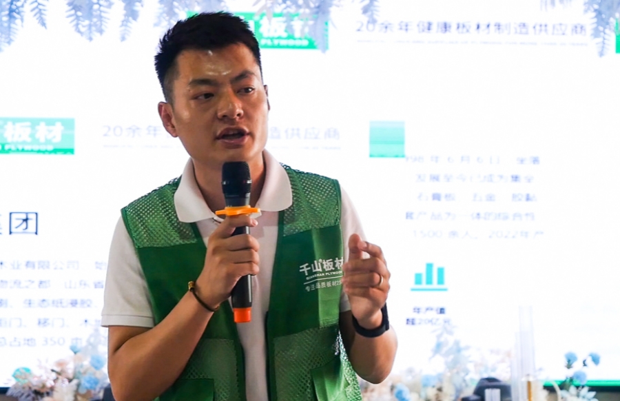 千山板材北方大區(qū)負(fù)責(zé)人史生平致辭,史總分享了千山板材對家具板質(zhì)量和技術(shù)的把控,希望帶給消費(fèi)者朋友們一個(gè)健康、環(huán)保、舒適的家庭環(huán)境。
