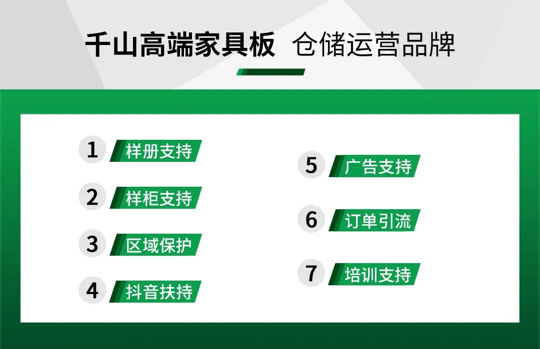 千山擁有完善的加盟體系,全國“一縣一代”火熱招商,更有樣冊支持、樣柜支持、區(qū)域保護(hù)、抖音扶持、廣告支持、訂單引流、培訓(xùn)支持7大政策支持,全方位助力經(jīng)銷商伙伴贏戰(zhàn)終端市場。