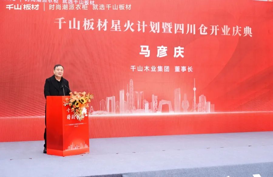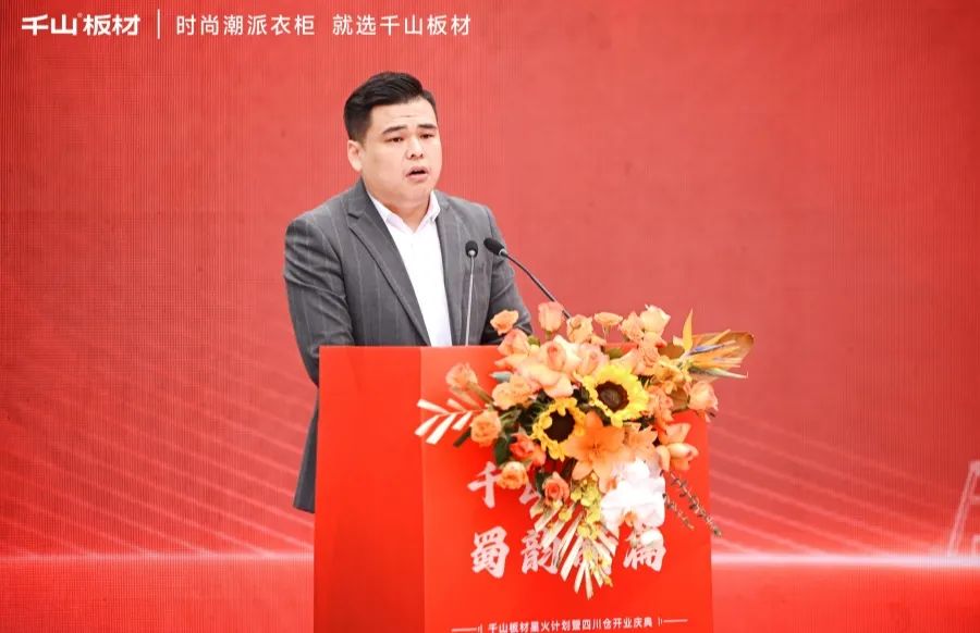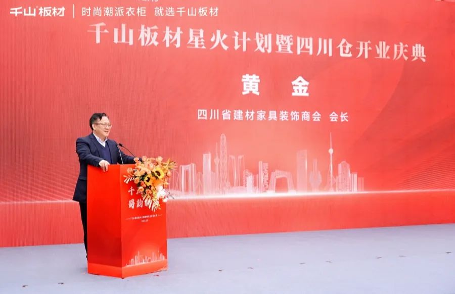 四川省建材家具裝飾商會會長黃金先生發(fā)表致辭。黃會長表達(dá)了對千山板材四川倉的美好期許和祝愿,并表示四川家具市場的繁榮與發(fā)展,離不開千山板材等一眾優(yōu)秀供應(yīng)鏈品牌的入駐與支持,也希望四川倉合力共上,迎來高質(zhì)量發(fā)展。