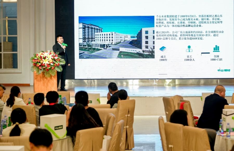 千山板材銷售部總監(jiān)董向陽上臺致辭。董總表示,千山堅定品牌高端化發(fā)展方向,堅定產品研發(fā)投入,堅定營銷渠道精進!站在全面發(fā)展的新階段,千山已做好充足準備,和伙伴們一起迎接挑戰(zhàn),合作共贏。