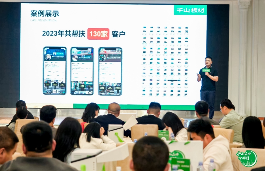 千山板材大區(qū)經理王殿忠為大家分享了《新媒體運營獲客》,向大家展示了千山板材優(yōu)秀經銷商的短視頻賬號實例,對標簽內容進行剖析,鼓勵大家勇于提升新媒體運營能力,挖掘線上客戶,助力終端銷售。