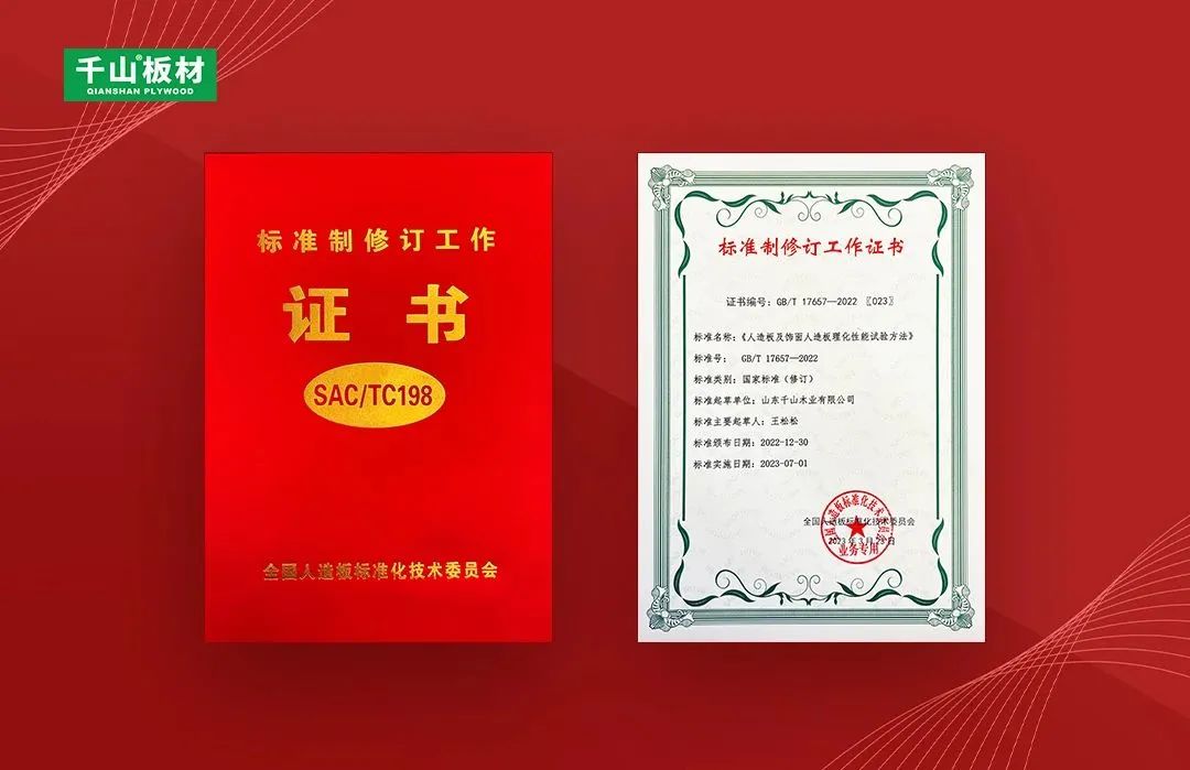 2023年3月,由全國人造板標(biāo)準(zhǔn)化技術(shù)委員會、中國林業(yè)科學(xué)研究院木材工業(yè)研究所、林業(yè)產(chǎn)業(yè)標(biāo)準(zhǔn)化國家創(chuàng)新聯(lián)盟主辦的《人造板及飾面人造板理化性能試驗方法》等新頒布標(biāo)準(zhǔn)宣貫培訓(xùn)暨產(chǎn)業(yè)發(fā)展研討會在浙江南潯召開,千山應(yīng)邀出席并獲頒國家標(biāo)準(zhǔn)制修訂工作證書。
