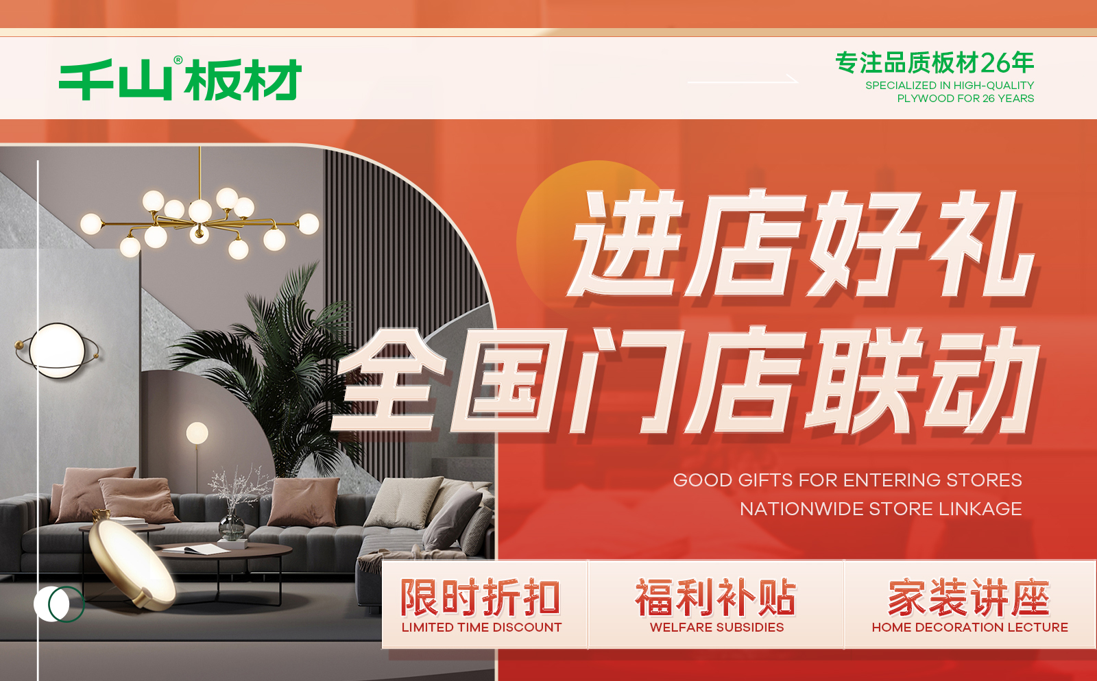 家裝節(jié)期間,千山板材全國(guó)線下門店將開(kāi)展多種形式的現(xiàn)場(chǎng)體驗(yàn)活動(dòng),限時(shí)折扣、福利補(bǔ)貼、家裝講座、進(jìn)店好禮等火力全開(kāi),更有爆款套餐,掀起家裝熱浪!具體活動(dòng)政策以終端門店為準(zhǔn),詳情咨詢千山板材全國(guó)各大授權(quán)門店。