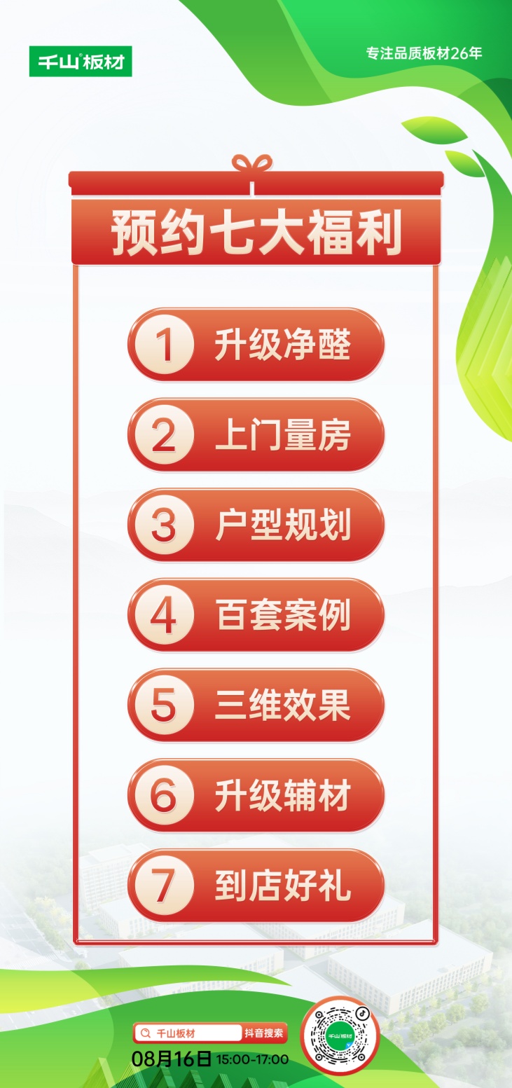 千山板材全國(guó)線下門店將為您提供卓越的支持和幫助,讓我們一起FUN心購(gòu)!8月16日-9月16日,鎖定千山板材官方直播間,享多重家裝好禮!