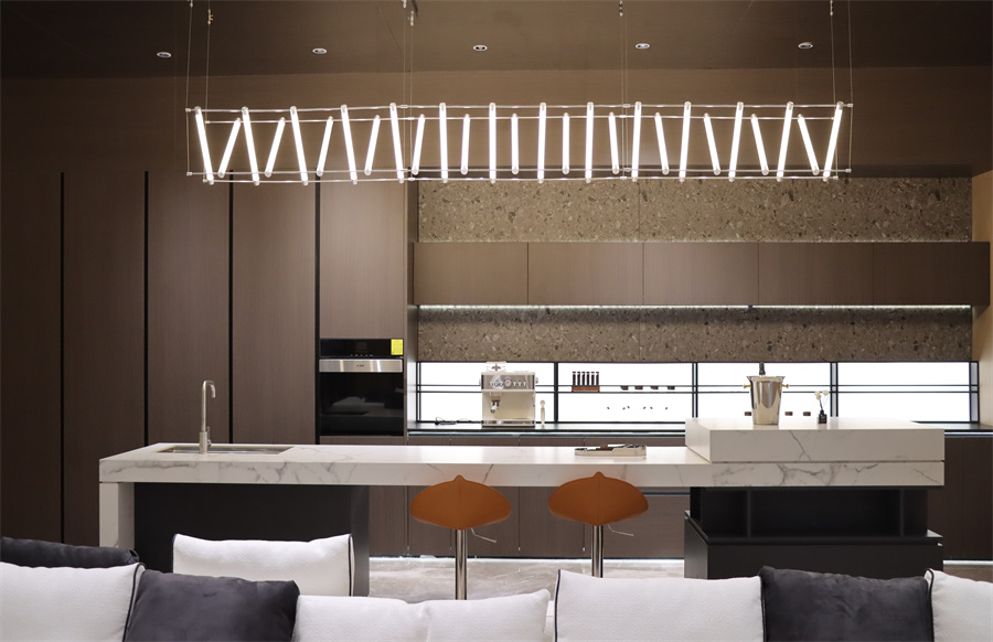 跟隨展廳動線,來到了現(xiàn)代風(fēng)格的開放餐廚展區(qū)。護(hù)墻板主體顏色為侘寂風(fēng)×朝陽橙,采用18厘ENF級刨片板,展示柜采用意大利石紋×芬蘭玉石,營造現(xiàn)代富有格調(diào)的空間氛圍。