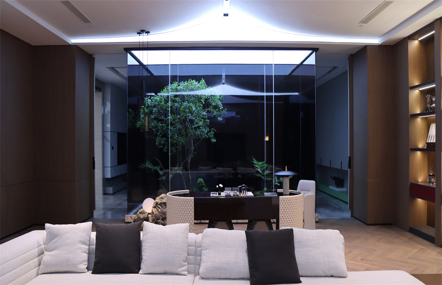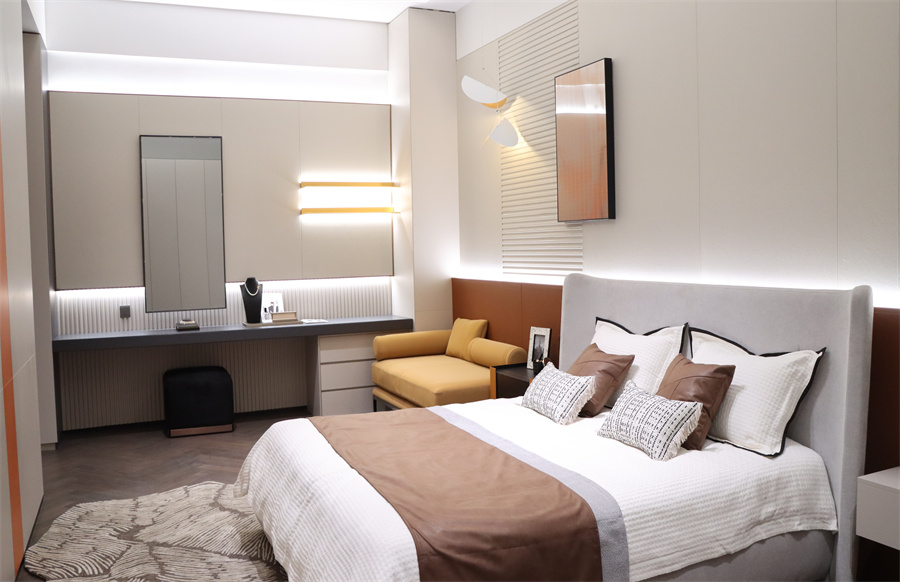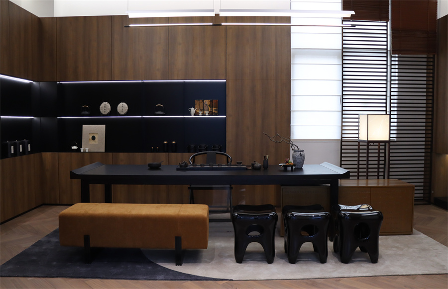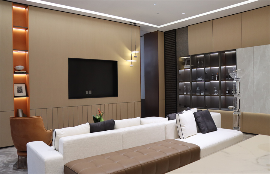展廳五大空間呈現(xiàn)現(xiàn)代極簡、現(xiàn)代輕奢、新中式三大主流家裝風(fēng)格,采用千山板材四大品類,糅合六大系列花色:木紋系列、純色系列、石紋系列、同步系列、數(shù)碼系列、PET系列,演繹多元化生活場景。