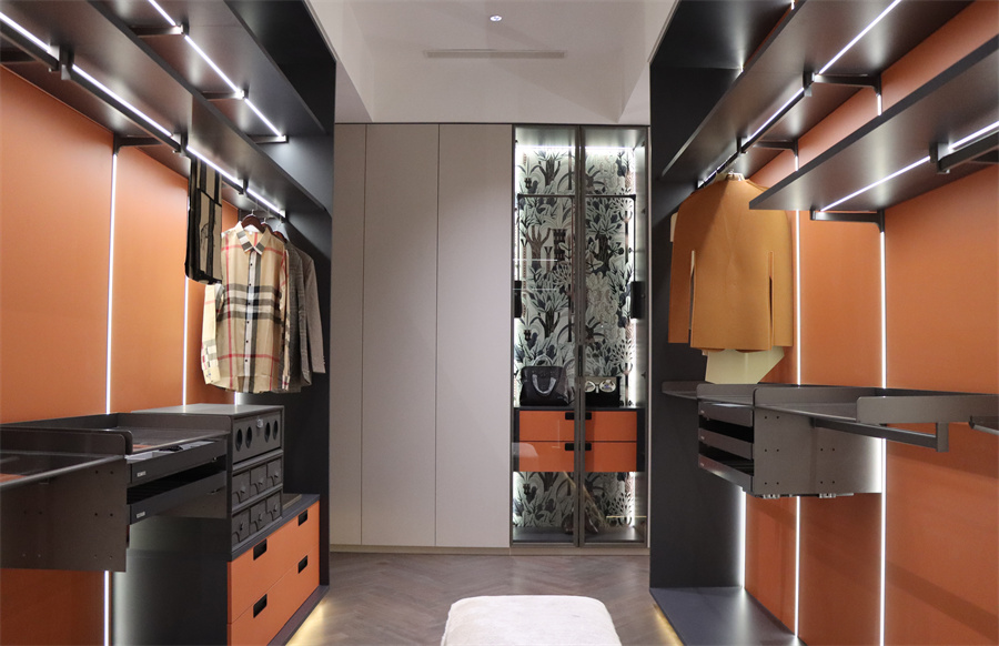 整體色調(diào)以深灰×西柚紅為主,形成鮮明對比,視覺效果強(qiáng)烈,秘境森林背板點(diǎn)綴整個衣帽間。置物柜采用當(dāng)下流行工藝,四邊45°斜切,簡約風(fēng)格深受年輕人喜愛。