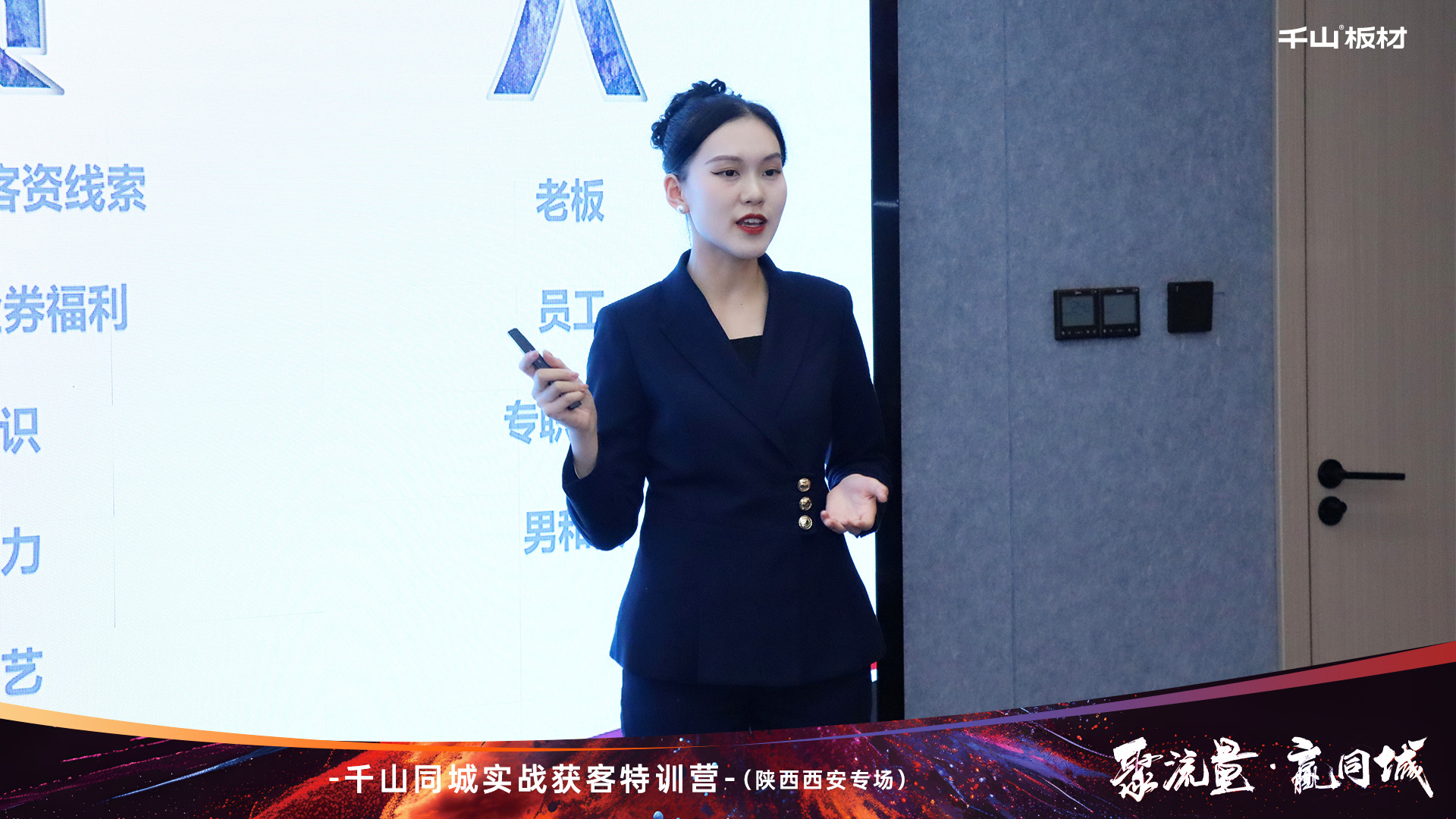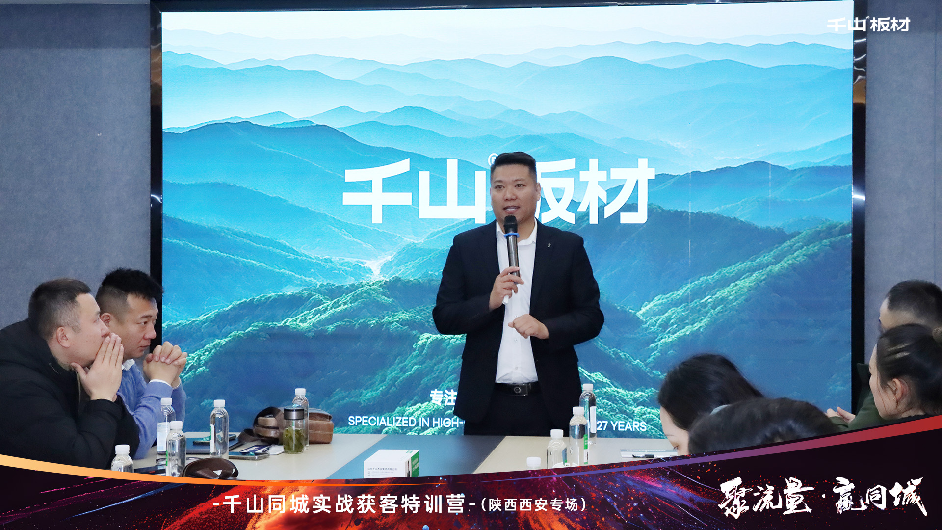 跟上新賽道風(fēng)向,拓展流量致勝渠道?;顒娱_始,千山板材陜西倉總經(jīng)理王國棟致辭。王總表示:面對新媒體發(fā)展浪潮,我們要轉(zhuǎn)變營銷思維,積極布局抖音同城,打通線上的獲客轉(zhuǎn)化。
