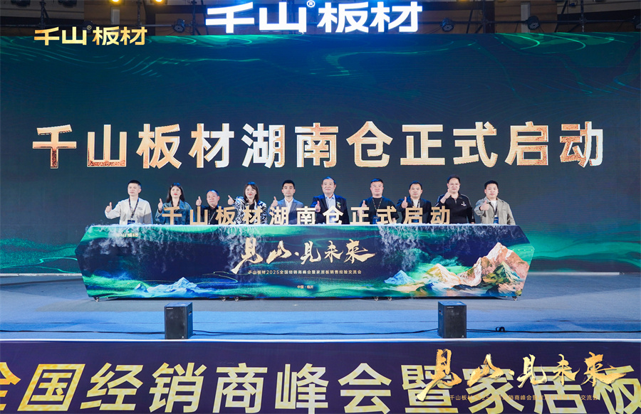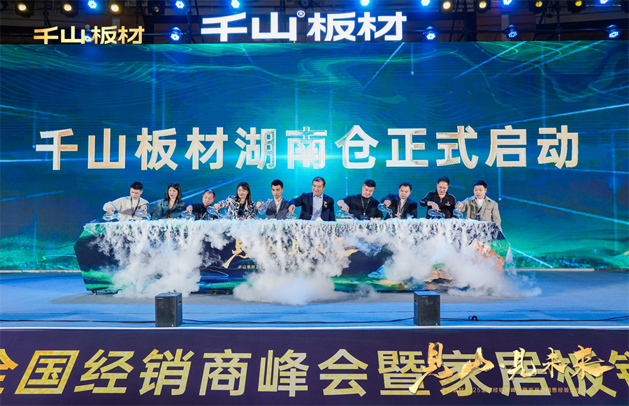 馬彥慶董事長、王松副總經(jīng)理以及千山板材湖南倉經(jīng)銷商代表孫丁娟、李濤、李維新、肖曉燕、陳江南、李輝、劉凡華、周亮共同登臺,攜手啟動千山板材全國現(xiàn)貨倉第四大倉——湖南倉。