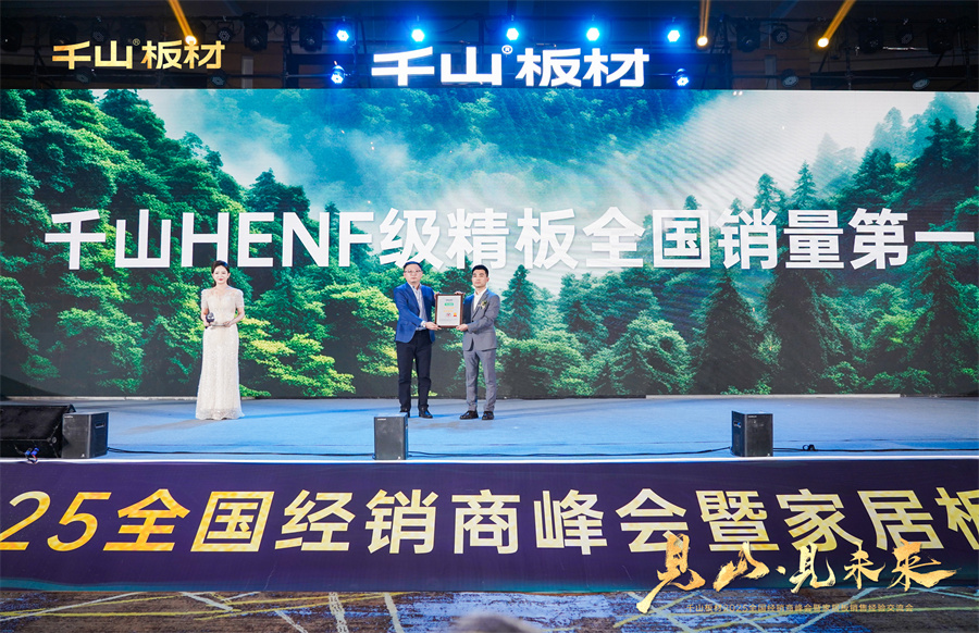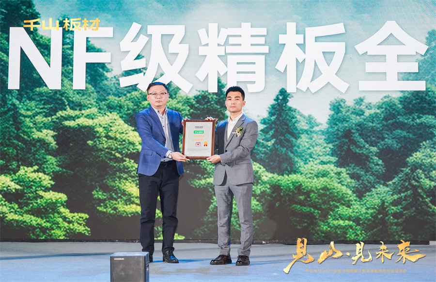中國最具領(lǐng)導(dǎo)力和權(quán)威性的認(rèn)證公司——尚普咨詢集團(tuán),其資深合伙人曹頡先生親臨峰會現(xiàn)場,為千山板材帶來極具分量的權(quán)威認(rèn)證——千山板材HENF級精板全國銷量第一!這一榮譽(yù)不僅彰顯了千山板材在市場上的卓越表現(xiàn),更激勵著千山繼續(xù)前行,勇攀高峰。