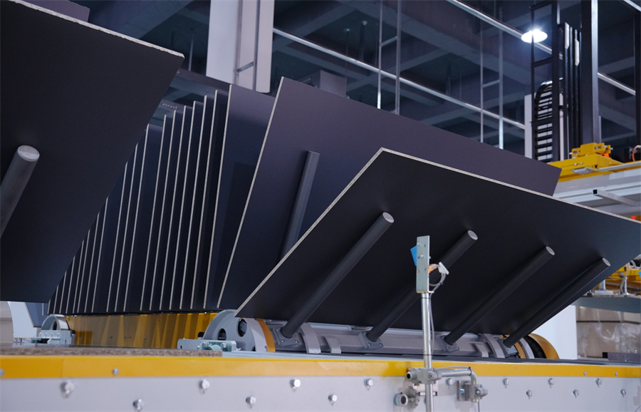 作為“壓貼領(lǐng)域的領(lǐng)導(dǎo)者”,溫康納在短周期壓貼領(lǐng)域處于世界領(lǐng)先地位,占據(jù)了國內(nèi)高端市場。相比于傳統(tǒng)壓貼產(chǎn)線數(shù)分鐘的周期,溫康納產(chǎn)線的壓貼周期大幅壓縮,效率提升數(shù)倍以上,產(chǎn)能可達(dá)到4800張/20小時。 溫康納智能化產(chǎn)線實現(xiàn)全流程自動化無縫銜接,從自動上下料、自動進(jìn)板裝置到壓機(jī)壓貼、清邊倒角、翻板檢驗等,每個環(huán)節(jié)都實時調(diào)控。更令人驚嘆的是紅外激光精準(zhǔn)對紋系統(tǒng),將誤差嚴(yán)格控制在毫米級以內(nèi),使板材紋理對接的美觀度實現(xiàn)質(zhì)的飛躍。 溫康納生產(chǎn)線保證了板材在最大壓貼范圍內(nèi)材料之間的最小厚度差,能夠更靈活地使用基材,同時確保產(chǎn)品質(zhì)量的穩(wěn)定性。溫康納的精密與進(jìn)口鋼板“珠聯(lián)璧合”,將使千山板材潮流花色達(dá)到行業(yè)新高度,實現(xiàn)高顏、高質(zhì)、高品體驗。 溫康納生產(chǎn)線的引進(jìn)是千山智能制造戰(zhàn)略的重要組成部分。在消費升級和產(chǎn)業(yè)轉(zhuǎn)型的大背景下,千山并沒有選擇簡單擴(kuò)大產(chǎn)能的道路,而是通過引進(jìn)頂尖技術(shù)裝備,實現(xiàn)從“制造”到“智造”的跨越。