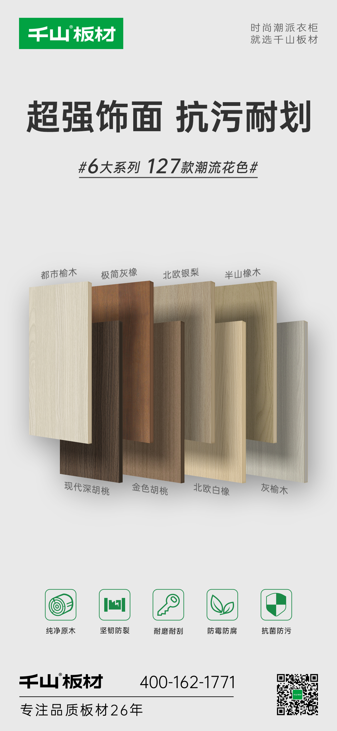 6大系列127款潮流花色涵蓋木紋系列32款、純色系列41款、高定系列10款、數(shù)碼系列24款、布紋石紋系列8款、門板系列12款,滿足多樣化的裝修風(fēng)格。