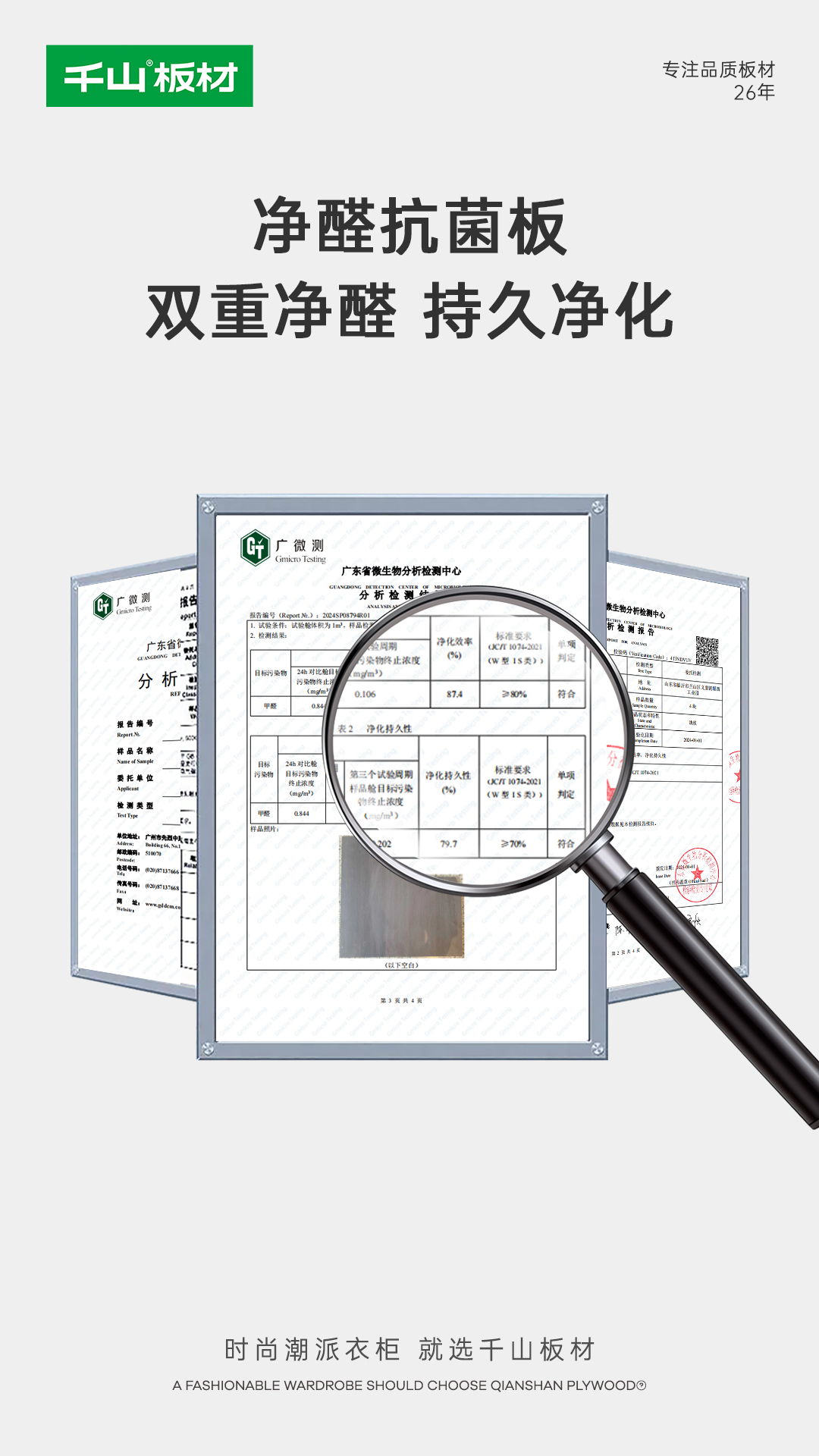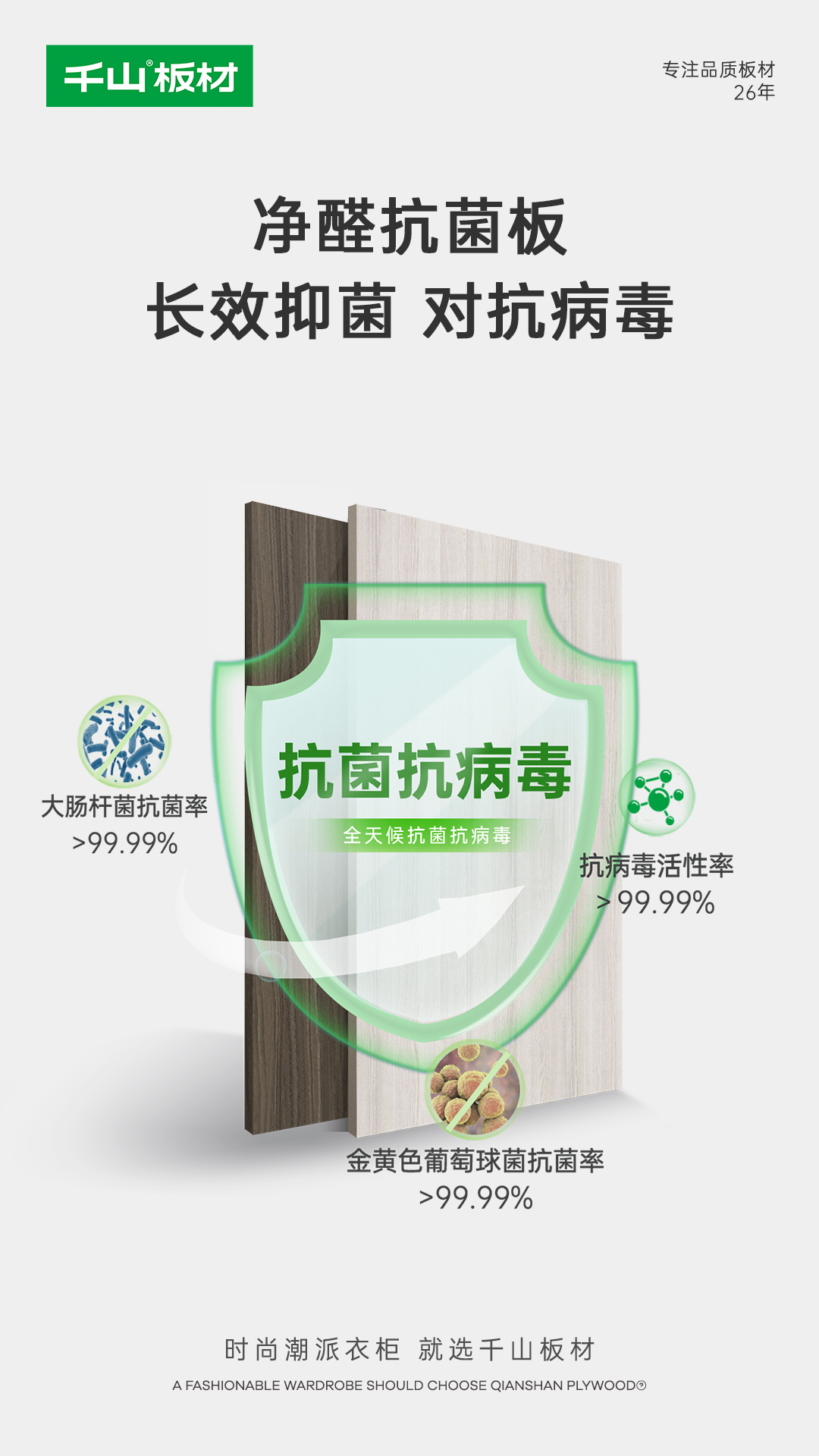 千山板材凈醛板采用ENF級無醛添加基材,涵蓋刨片板、多層板、實木板,以六大硬核優(yōu)勢強效發(fā)力,凈醛、抗菌、抗病毒三效合一,開啟環(huán)保新“凈”界,從源頭打造“無醛”之家。