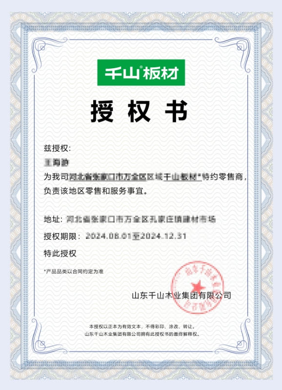 為了廣大消費(fèi)者的切身權(quán)益和消費(fèi)體驗(yàn),購(gòu)買產(chǎn)品時(shí),應(yīng)選擇千山板材授權(quán)的銷售渠道,可查看經(jīng)銷商授權(quán)證明文件。