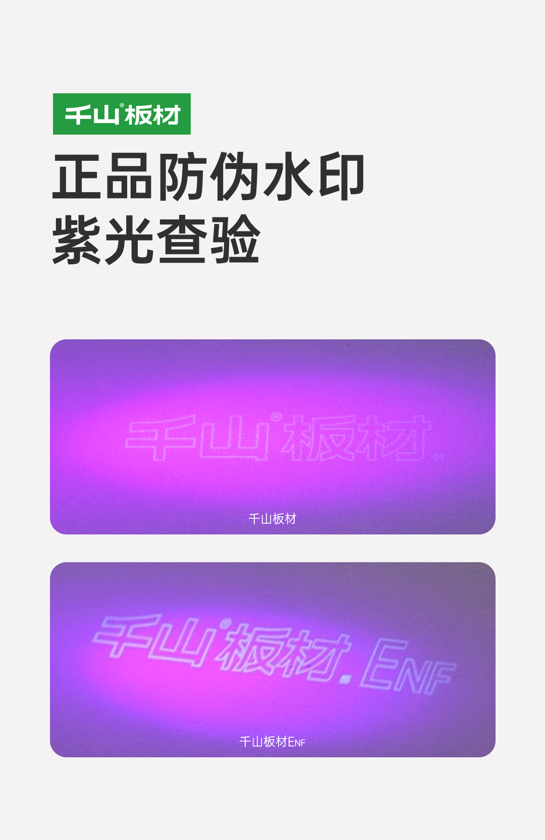 正品千山板材表面都印有隱形防偽標(biāo)識(shí),使用紫光手電筒照射板材表面,顯現(xiàn)“千山板材” 或 “千山板材ENF”水印,凈醛板顯現(xiàn)“凈醛 抗菌 抗病毒”水印。