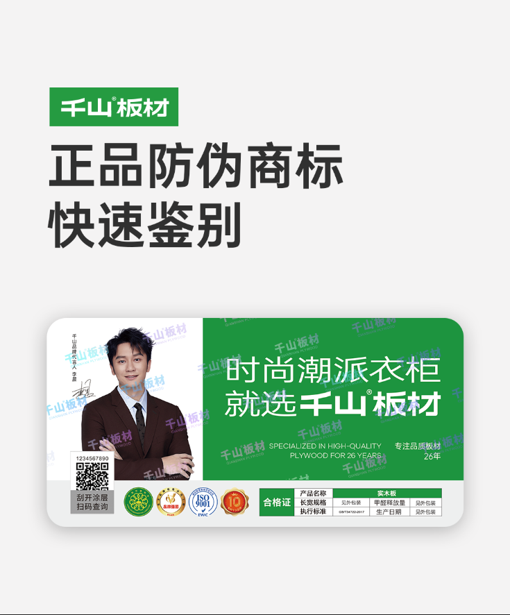 嚴(yán)控質(zhì)量標(biāo)準(zhǔn),捍衛(wèi)消費(fèi)者權(quán)益,千山板材一直致力于為消費(fèi)者提供優(yōu)質(zhì)的產(chǎn)品和服務(wù)。千山板材通過不斷優(yōu)化精進(jìn)防偽設(shè)計(jì),來(lái)抵制假冒偽劣產(chǎn)品。今天,千山板材防偽攻略特別上線,為您的安心保駕護(hù)航!