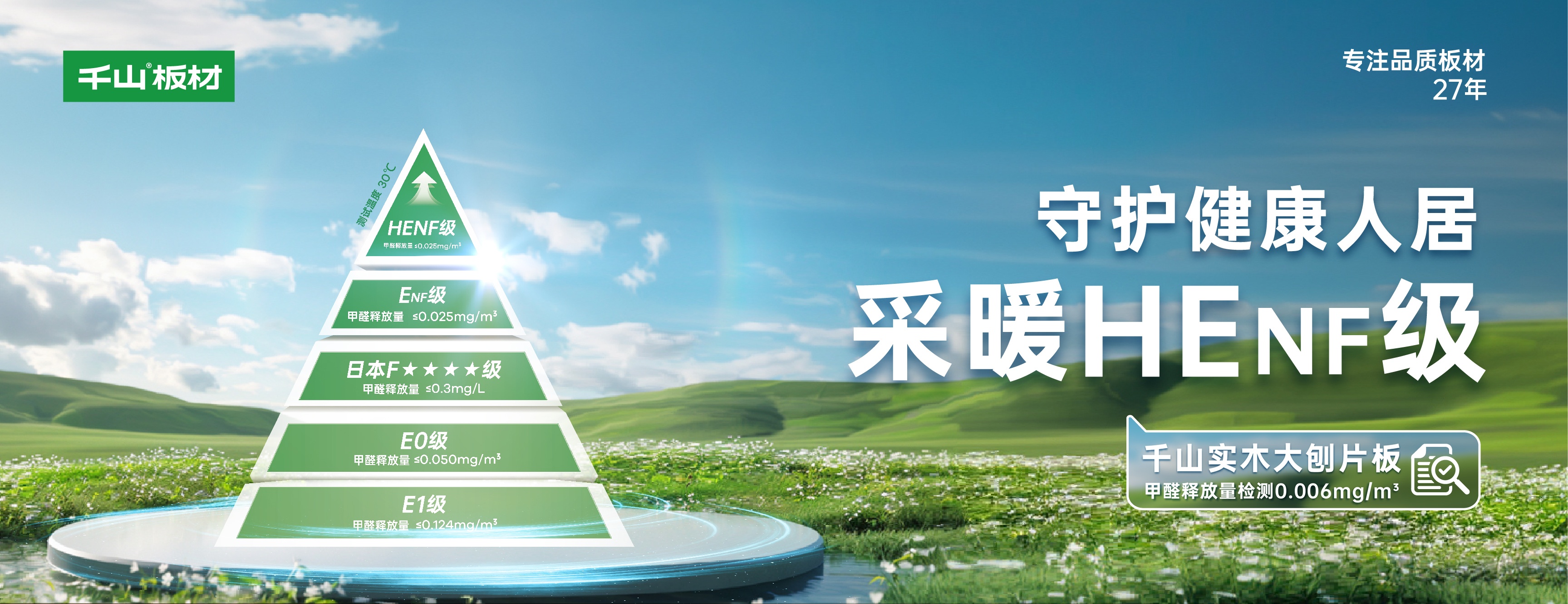 千山HENF級板材憑借其卓越性能,從根源上減少有害物質(zhì)釋放,為居住者構(gòu)筑起一道堅實的健康屏障,真正實現(xiàn)"即裝即住"的健康宜居生活愿景。