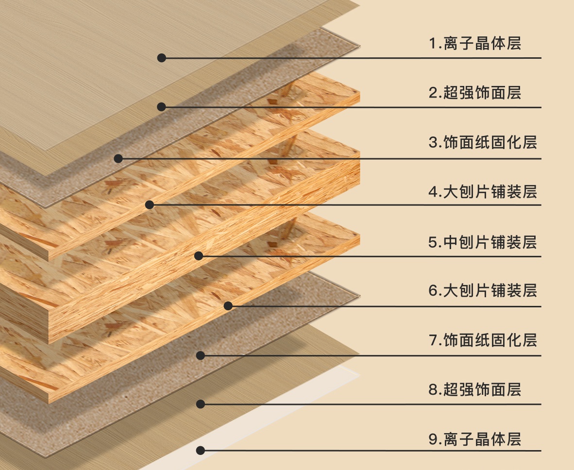 定向鋪裝芯層+固化層+離子晶體層,穩(wěn)定堅(jiān)韌結(jié)構(gòu)能夠經(jīng)受南北方環(huán)境考驗(yàn),規(guī)避門板變形和表層開(kāi)裂問(wèn)題。