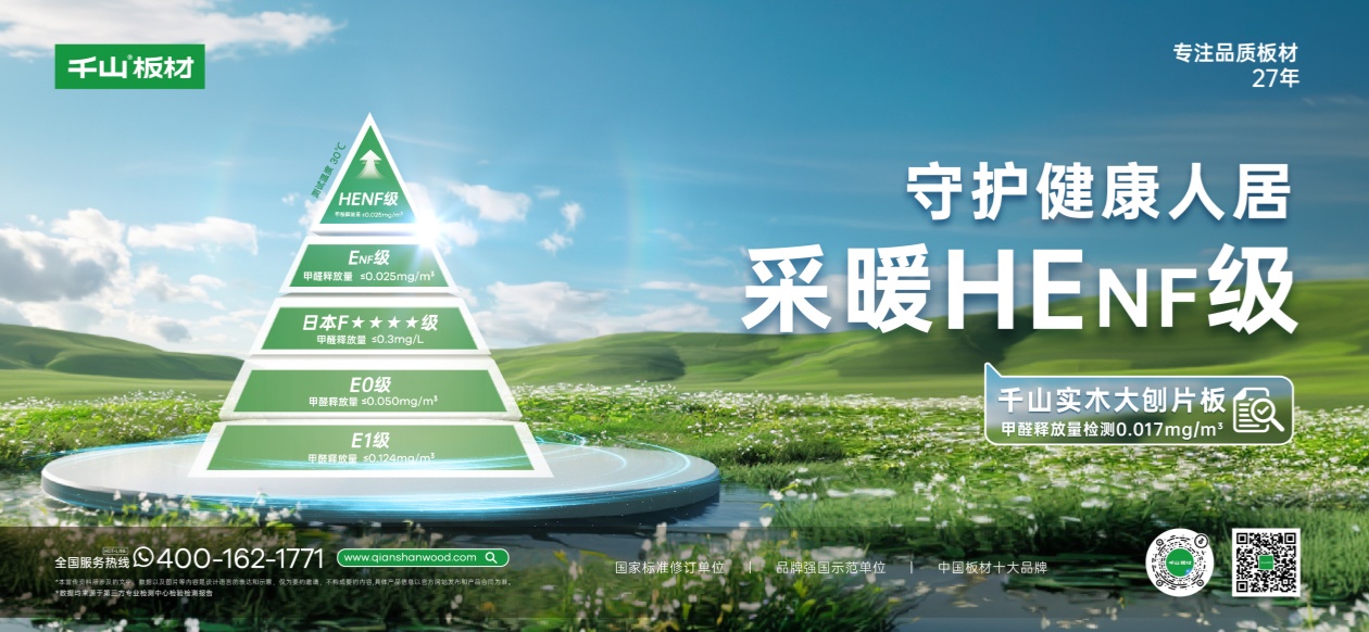 傳統(tǒng)板材環(huán)保標(biāo)準(zhǔn)多聚焦于常溫環(huán)境下的甲醛釋放量,而HEnf級的甲醛釋放量在30℃熱環(huán)境下被嚴(yán)格限制在0.025mg/m3以內(nèi),是中國林產(chǎn)工業(yè)協(xié)會于2022年5月31日發(fā)布的《采暖用人造板及其制品中甲醛釋放限量》(T/CNFPIA 1003-2022)標(biāo)準(zhǔn)中的最高等級。HENF級:環(huán)保的升級躍遷千山板材四大品類: