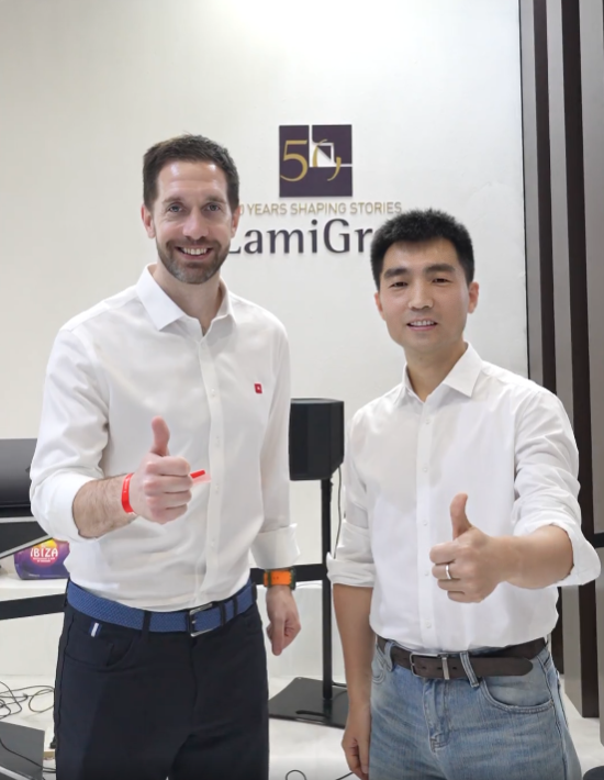 如果說德國工藝賦予千山板材以“骨血”,那么歐洲設(shè)計則為其注入了“靈魂”。在西班牙拉米展位,王總與拉米負(fù)責(zé)人進(jìn)行深入交流。